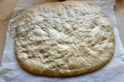 Placez la pâte sur une feuille de papier cuisson et étalez-la avec le bout des doigts (surtout pas avec un rouleau à pâtisserie, elle ne monterait pas bien par la suite).